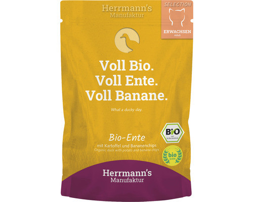 Összetevők: 94,2 % kacsa* (hús, hasított test, szív, nyak, máj), 1,55 % sörélesztő, 1,5% burgonya*, 1 % napraforgóolaj*, 0,5% banán chips*, 0,5% kókuszdió