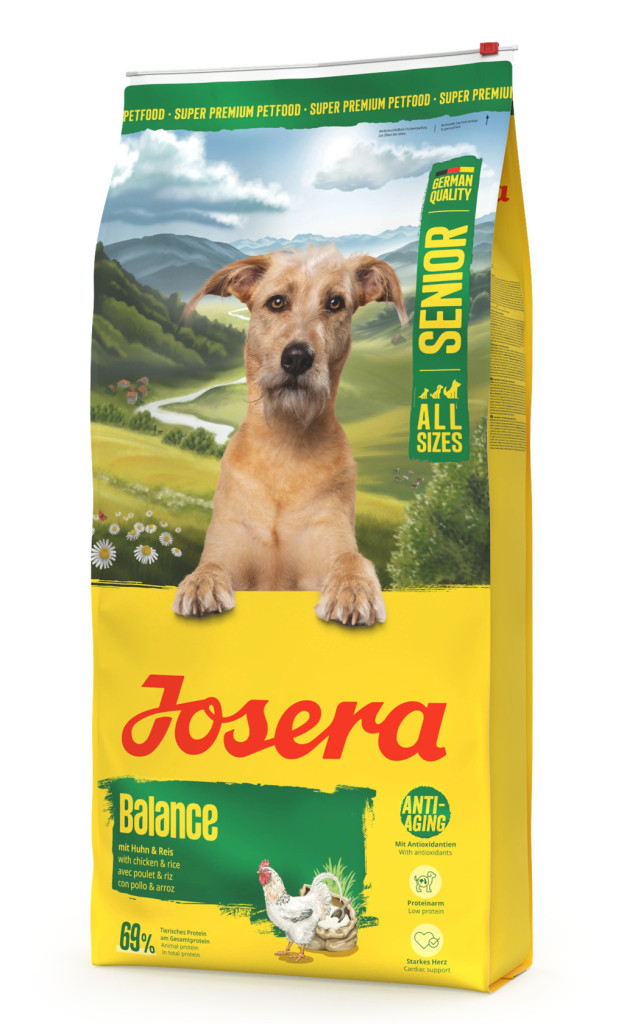 A Josera Balance (senior) gluténmentes, alacsony zsírtartalmú és alacsony fehérjetartalmú száraztáp csirkével és rizzsel az idősebb kutyák számára.