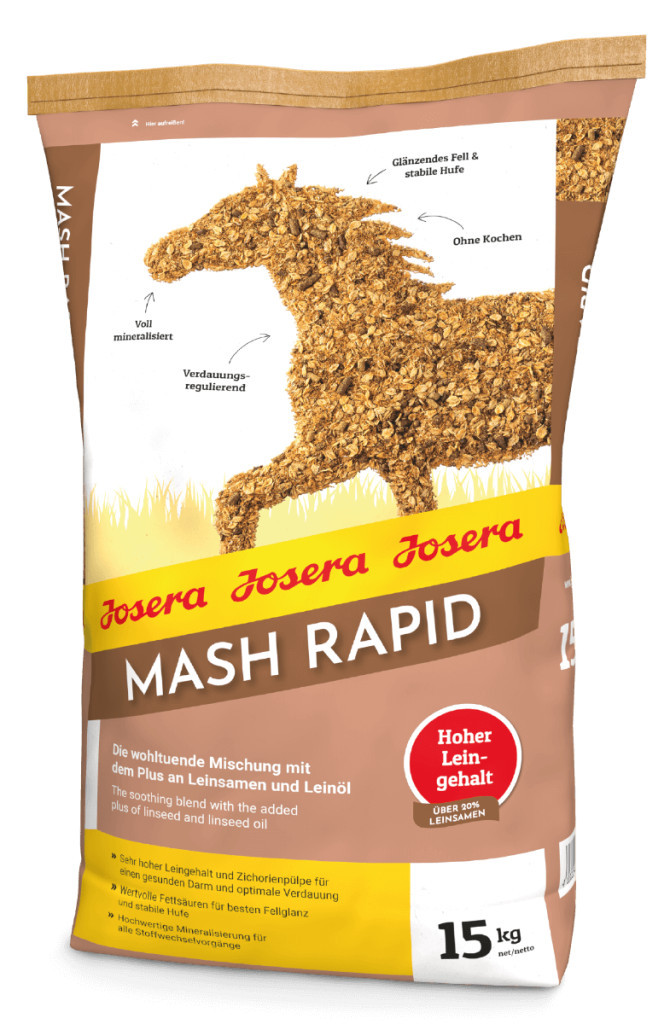 Normál takarmányozás mellett (széna+abrak) kiegészítésként vagy az abrak helyett adható 1-2 kg JOSERA Mash Rapid hetente 2-3 alkalommal.