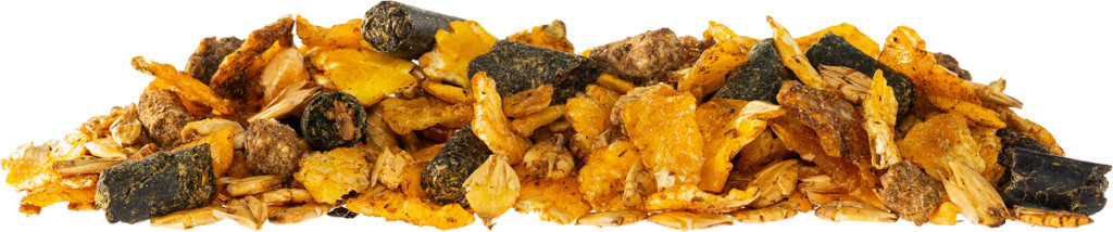 Hőkezelt kukoricapehely, hőkezelt árpapehely, kukoricacsíra, lucerna, hőkezelt lenmag, cukorrépa melasz, előkezelt búzaliszt, kukorica olaj, kalcium-karbonát, árpa, kukorica, búzakorpa, Ca-Na-foszfát, nátrium-klorid, magnézium-oxid, lecitin.