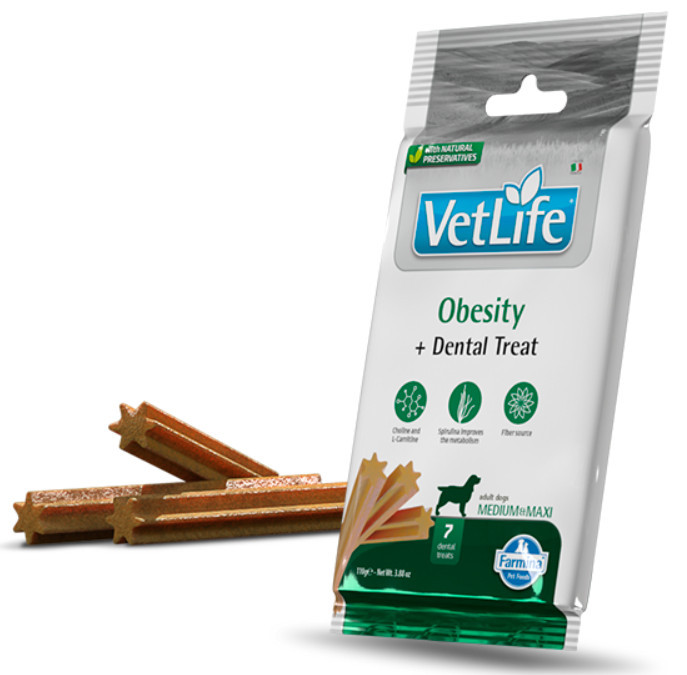 Farmina Vet Life Dog Obesity+Dental Treat fogtisztító jutalomfalat túlsúlyos vagy hízásra hajlamos felnőtt közepes vagy nagytestű kutyák számára.
